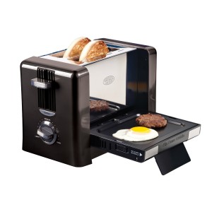 This bread and bagel toaster has a wide 2-slot toaster and a flip down griddle.