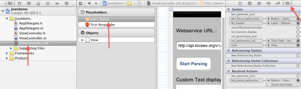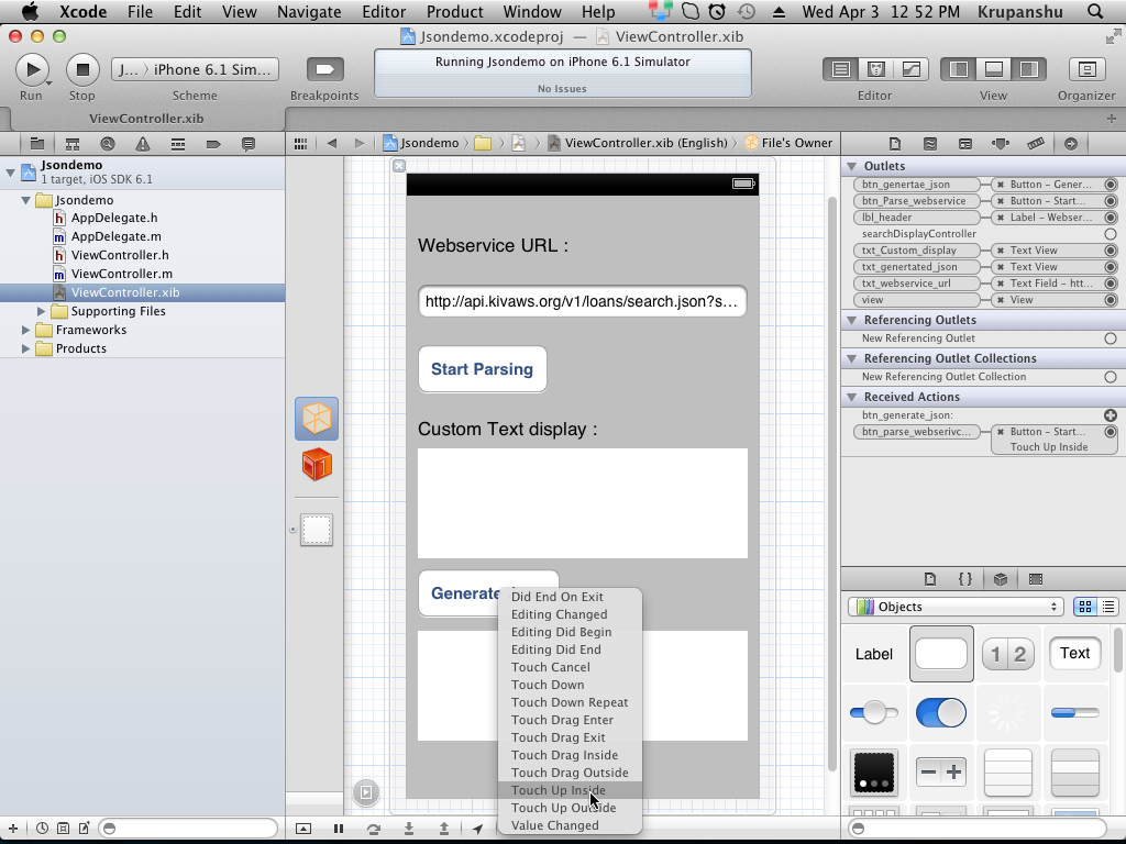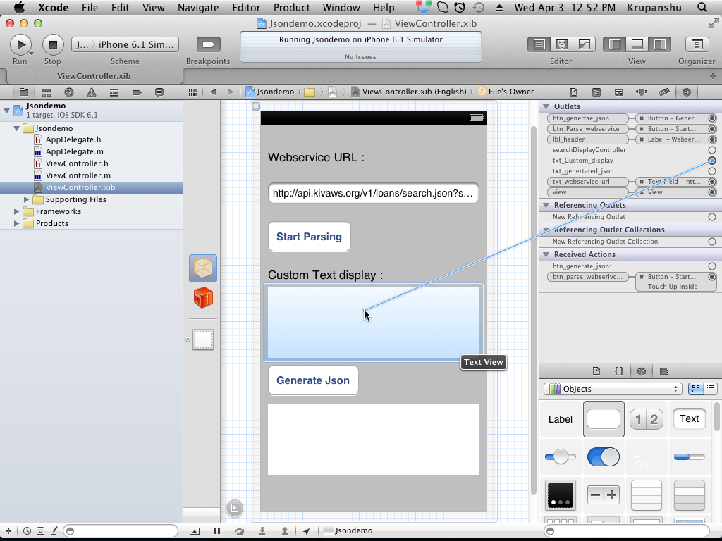 Here we create Outlet for both UITextView and UIButton. and create new method named “btn_genertae_json”.
