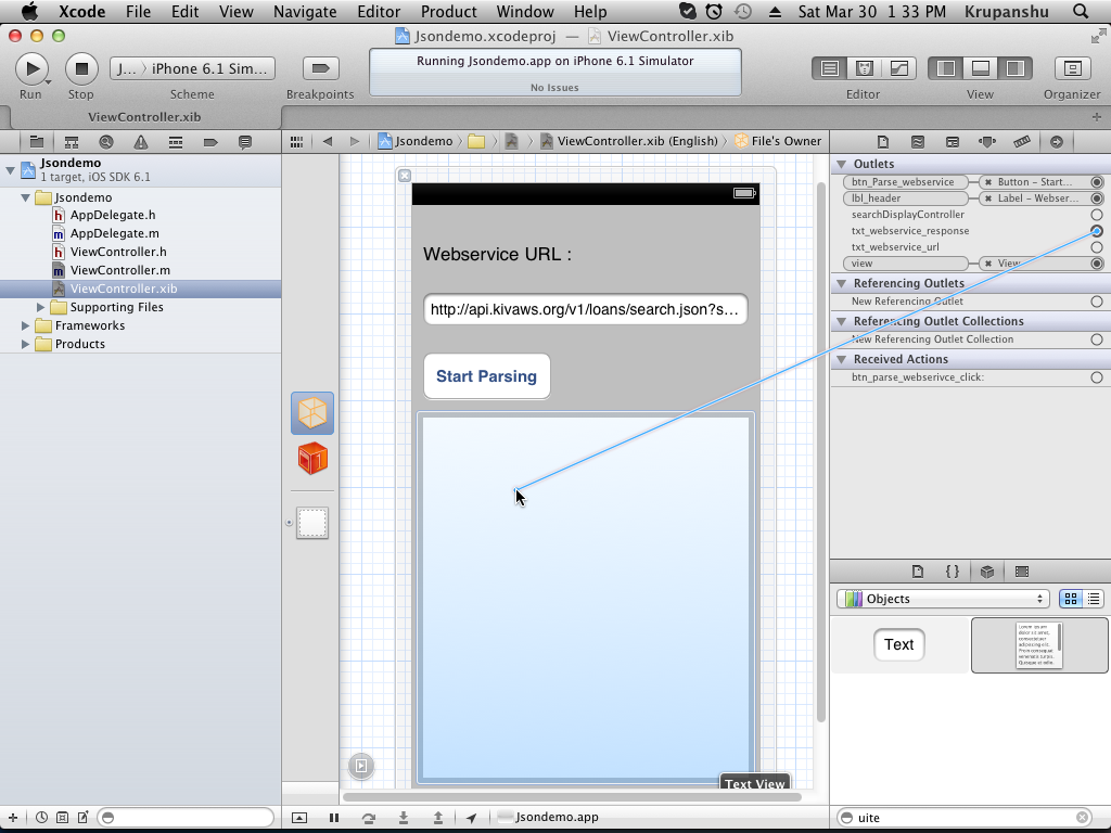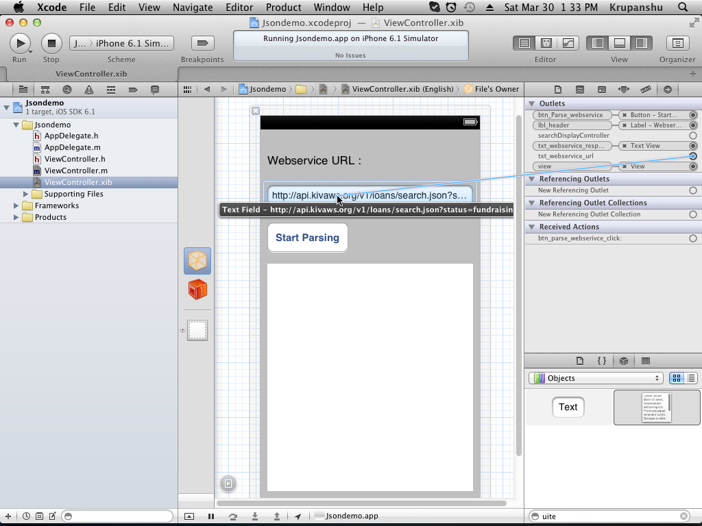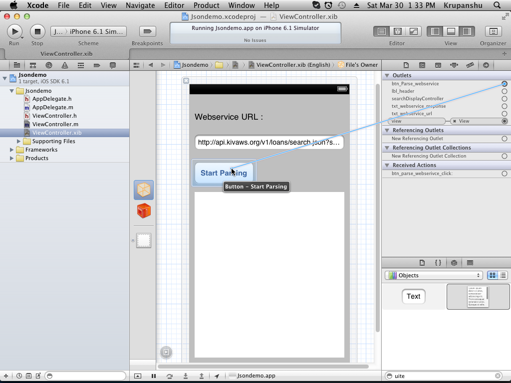 Create IBOutlet for all UI Elements and Method declaration for “Start Parsing” button click. Now Your code look like this :