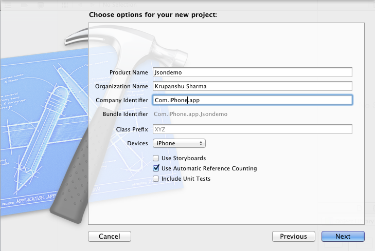 Name The Project Jsondemo. Select iPhone for device family , and make sure Use Atomic Reference Counting checkbox is checked.